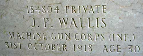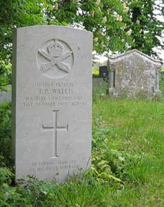 "Joseph Patman WALLIS Private 184804 Depot Training Bn., Machine Gun Corps (Inf) died at home on Thursday, 31st October 1918. Age 30. Born and resident Eversden, enlisted Caxton. Son of Joseph P. and Elsie Louisa P. Wallis. of Toft. Buried in GREAT EVERSDEN (ST. MARY) CHURCHYARD, Cambridgeshire. North of East end of church." |